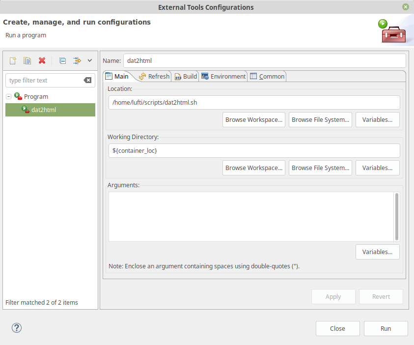 If the name of this script is dat2html.sh, set an External Tools Configuration of Eclipse as