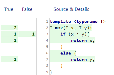 For a function template (or a member function of a class template), all instantiations share one counter set. Coverage measured by Testwell CTC++ refers to the common definition in source code, not to separate instantiations in binary code.