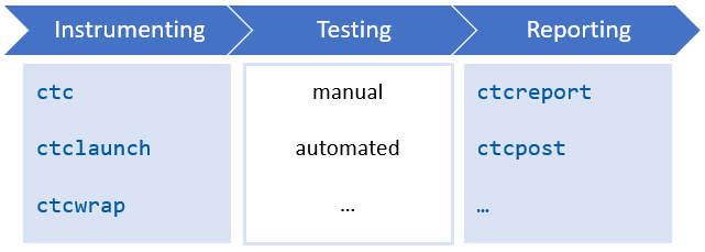 The work with Testwell CTC++ generally consists of three steps: Instrumenting, testing and reporting. Several independent command-line based tools are used for these steps, accompanied by different integrations for IDEs and build tool chains.