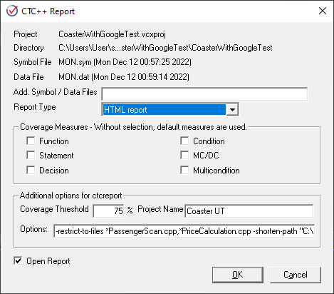 When the tests have been executed, reports are generated using the second menu entry. Several options for ctcpost and ctcreport can be chosen directly.